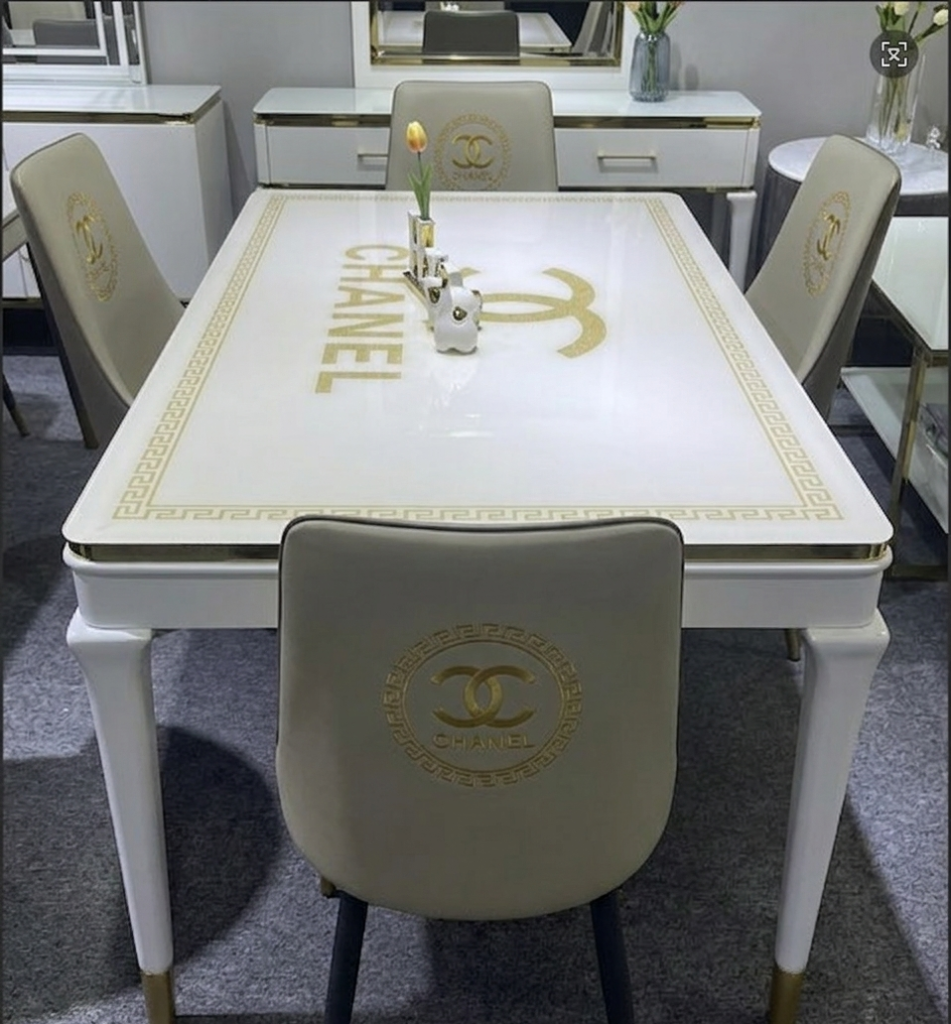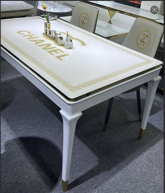 a white chanel dining table made with excellent craftmanship and a sweet blend of elegance and luxury