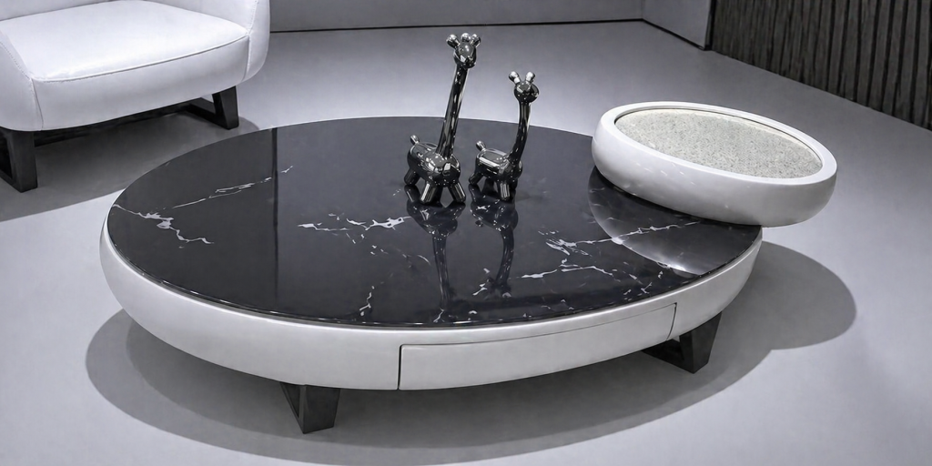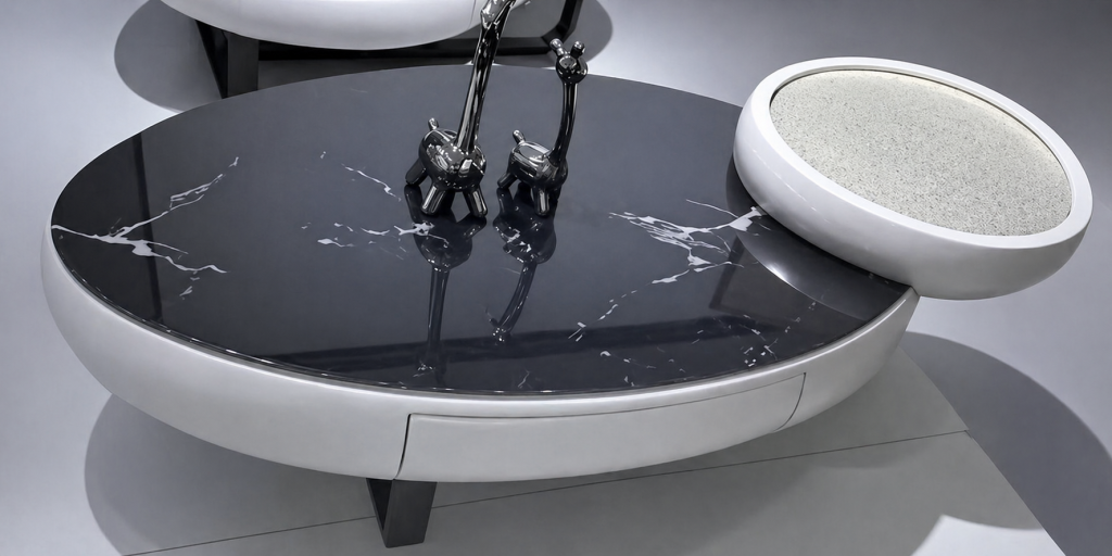 Command attention in your living space with the Starlight Orbit Hub. This set is a bold reimagining of the classic center table, trading traditional sharp angles for a fluid, aerodynamic silhouette that epitomizes the "Future-Modern" aesthetic.